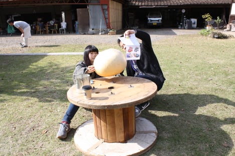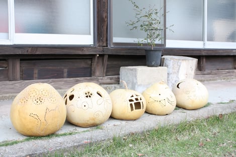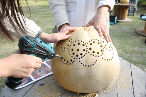 午後は、これまでお世話になった施設にプレゼントするために、ふくべのランプシェードをつくりました。メンバー同士で協力し合って、2人で1つずつ作っていきます。