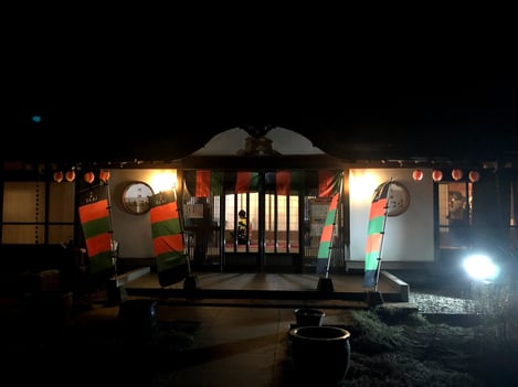 会場の外観に、提灯やのぼりをたてて……